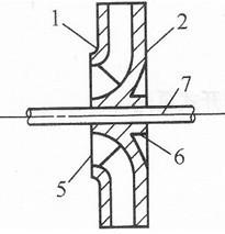 1一前蓋板;2一后蓋板;3一葉片;4葉槽;??? 1一吸人口;2一輪蓋;3一葉片5一吸水口;6一輪轂;7一泵軸??? 4一輪轂;5一軸孔