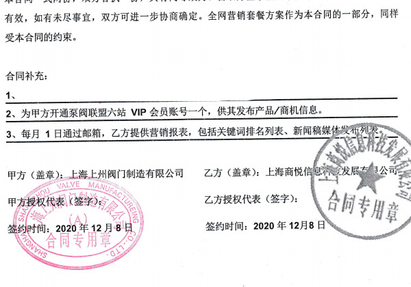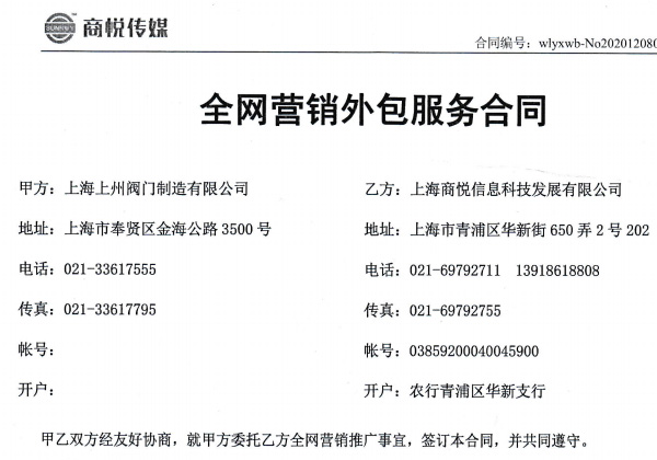 近日,商悅傳媒與上海上州閥門制造有限公司簽訂了12個月的網(wǎng)絡(luò)營銷外包服務(wù)合同。