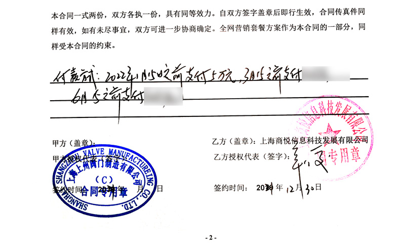 2021年12月30日,上海上州閥門制造有限公司與商悅傳媒簽訂第二年的網(wǎng)絡(luò)營(yíng)銷外包協(xié)議。