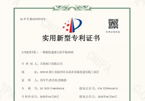 業(yè)內(nèi)專家認(rèn)為,隨著工業(yè)領(lǐng)域?qū)Ω咝?、安全閥門產(chǎn)品需求的不斷提升,快速排污功能將成為平板閘閥的重要發(fā)展方向。萬能閥門有限公司憑借此次專利的成功授權(quán),不僅強化了自身在技術(shù)研發(fā)上的競爭優(yōu)勢,也為行業(yè)整體的技術(shù)進步提供了借鑒。