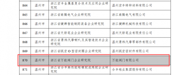 浙江省經濟和信息化廳日前正式發布《2025年度浙江省企業研究院建議認定名單》,萬能閥門有限公司憑借其在高端閥門研發領域的深厚積累與創新成果成功入選,標志著企業技術創新體系建設邁上新臺階。