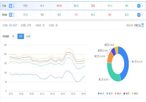 總關(guān)鍵詞排名數(shù)量178,其中第一頁占比45.51%;第二頁占比30.90%;總詞量排名在前兩頁的占76.41%