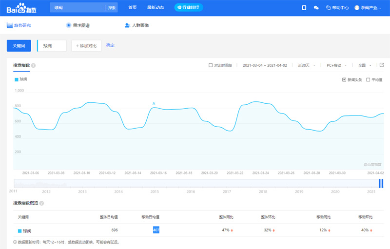 球閥是屬于熱門詞,在整個閥門系列中,球閥的產(chǎn)量和銷量都是排在zui前面的,因此搜索“球閥”這個詞的用戶也是非常的多。根據(jù)百度查詢指數(shù)工具顯示,球閥的整體日均搜索指數(shù)已達到696,移動端搜索指數(shù)達到407,依下圖所示。